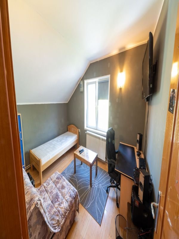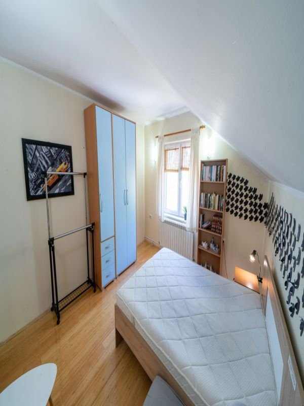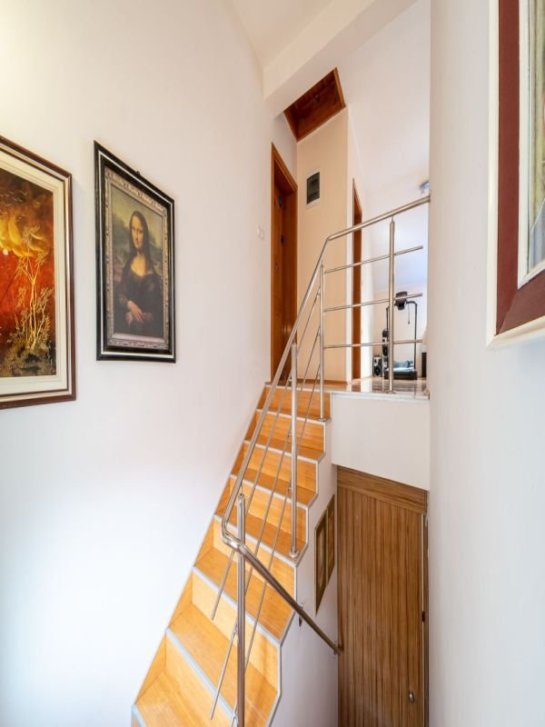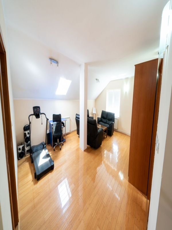 Spratna kuća u naselju Lesnina, na odličnoj lokaciji. Od prostorija sadrži u prizemlju: hodnik, soba, kuhinja, ostava, kupatilo, dnevna soba, spavaća soba; u potkrovlju se nalazi dnevna soba, 3 spavaće sobe, kupatilo. Kuća je veoma kvalitetno građena, cigla ipo+stirodur izolacija+bavalit, PVC stolarija, bambusov parket, grejanje je CG na plin, klima. Plac površine 307m2, ima kolski ulaz i garaža u dvorištu. Uknjiženo.